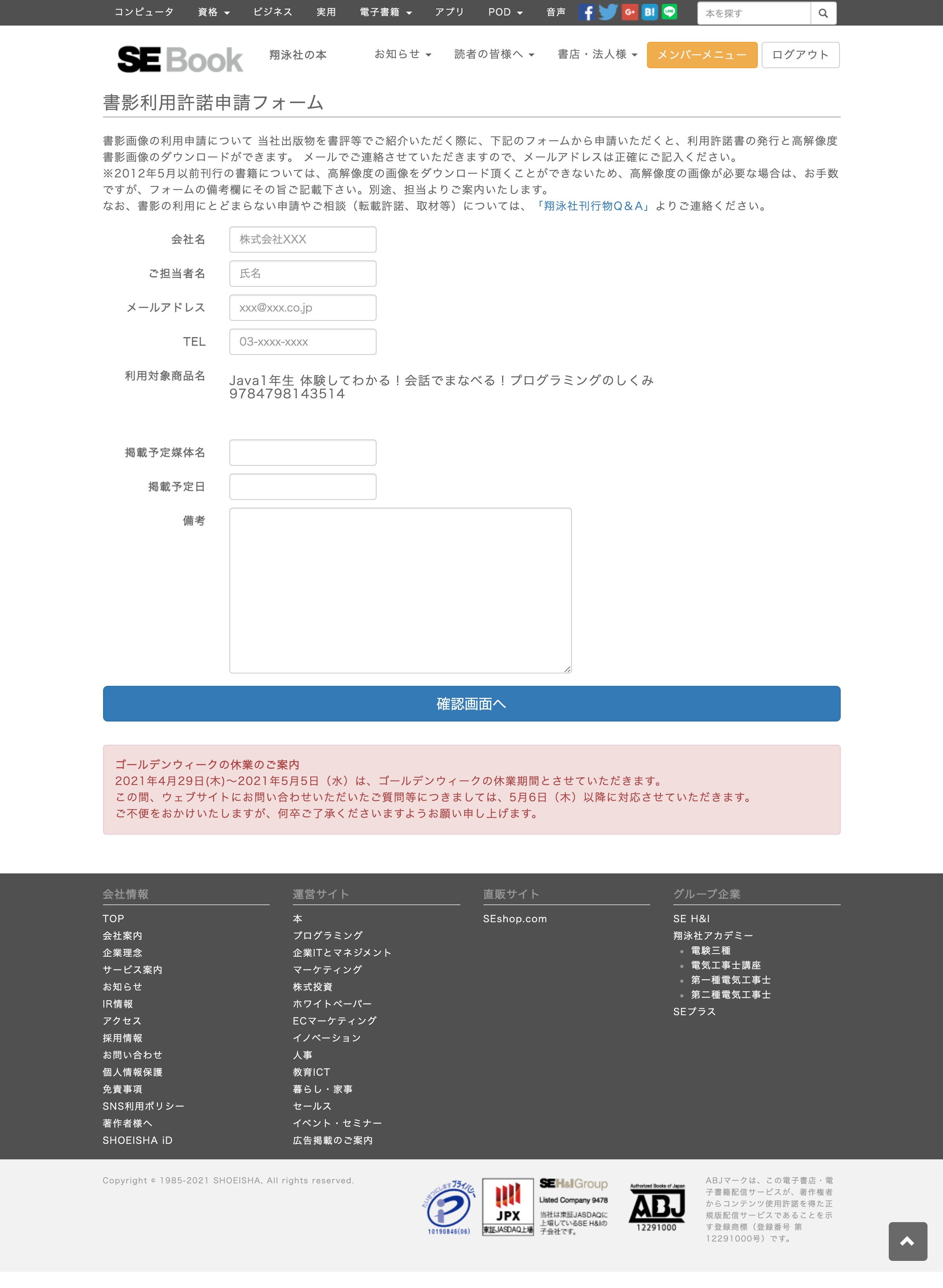 書影利用許諾申請フォーム あり